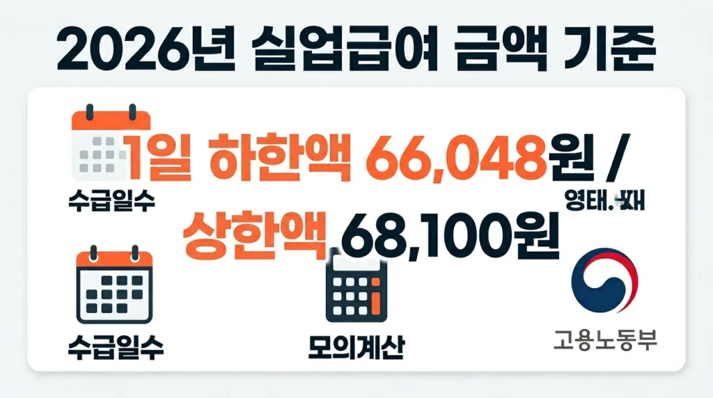 ✅ 2026년 실업급여 1일 하한액은 66,048원, 상한액은 68,100원이에요.